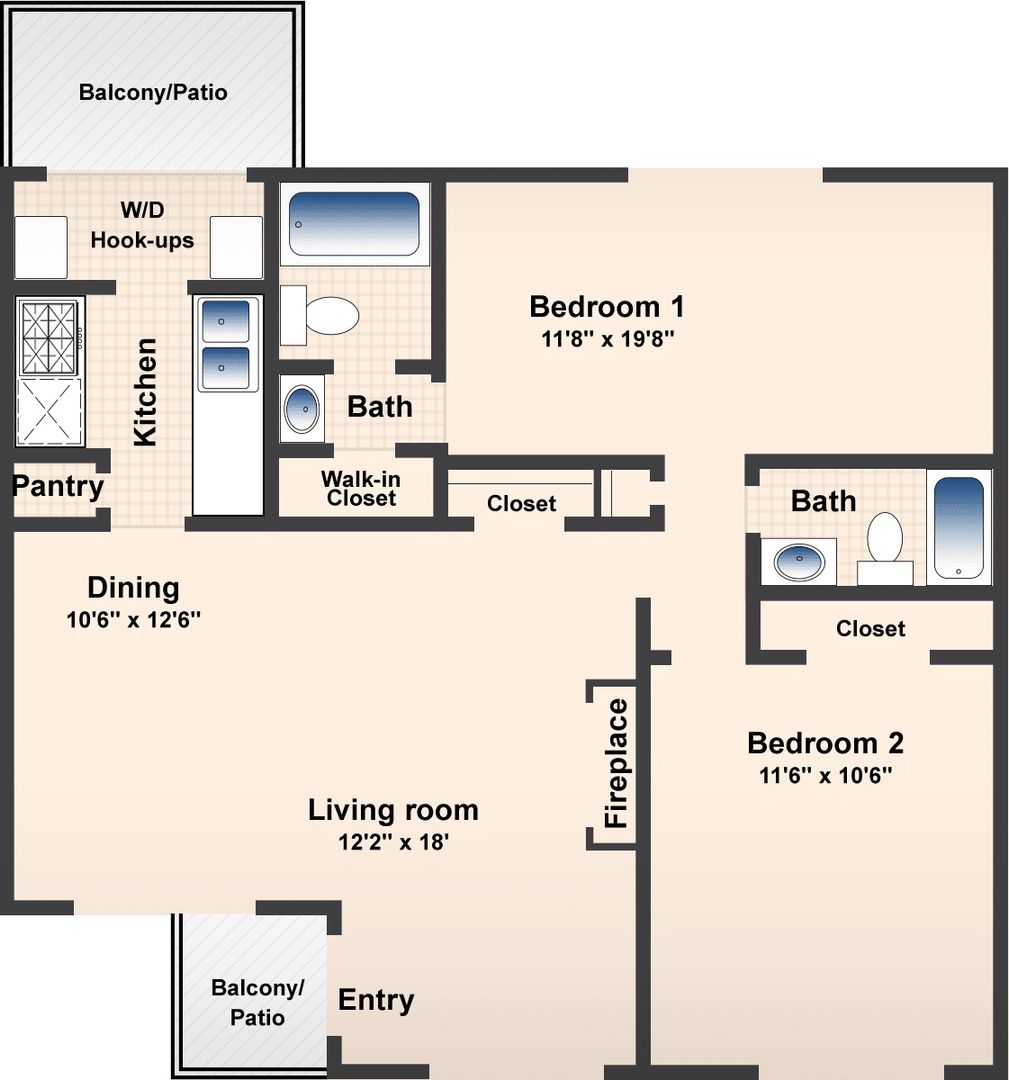 2 Bedroom, 2 Bathroom - Whitehall Apartments